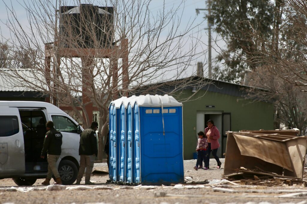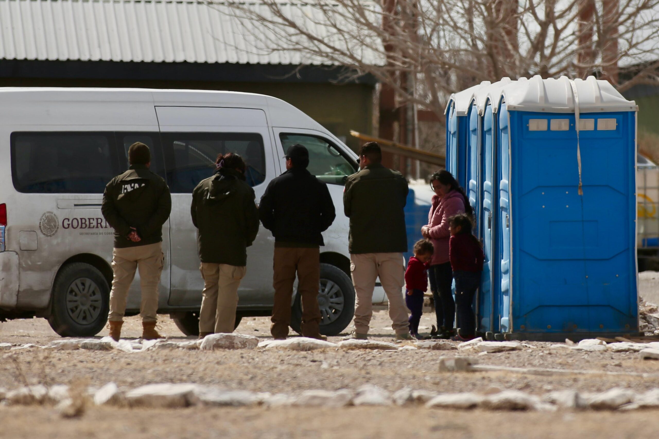 El equipo de Norte Digital documentó el momento en que una mujer con suéter rosa, baja de un vehículo de Gobernación para ir al baño con dos pequeños.