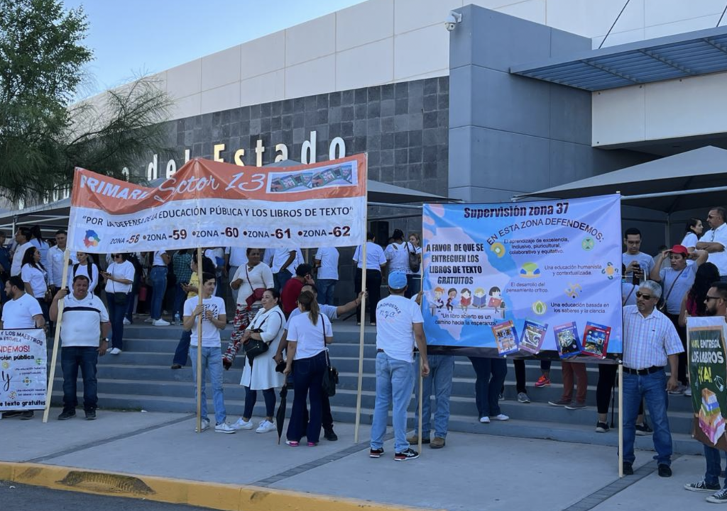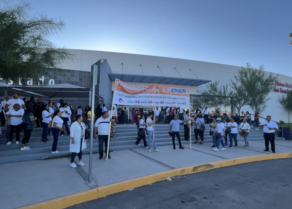 Al menos mil maestros juarenses se apostaron esta mañana en el exterior de las oficinas del Gobierno estatal ubicadas en la avenida Abraham Lincoln esta mañana para exigir la entrega de los libros de texto.