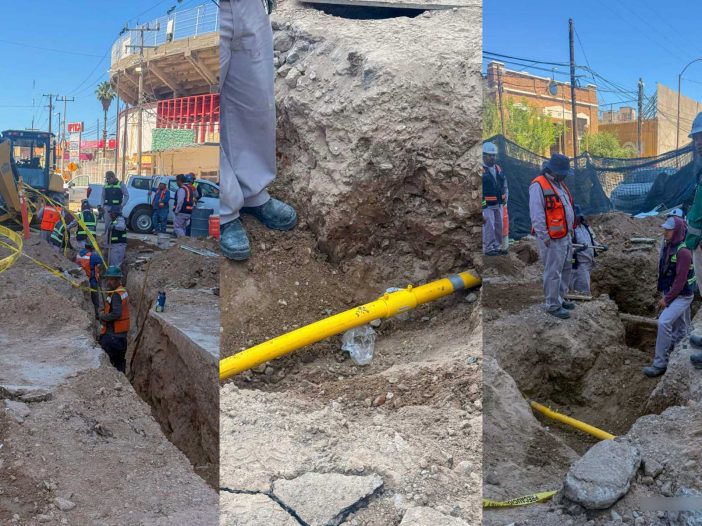 Equipos de la Junta Municipal de Agua y Saneamiento y de la empresa distribuidora de gas natural trabajan en el sitio para reparar el desperfecto y controlar la fuga