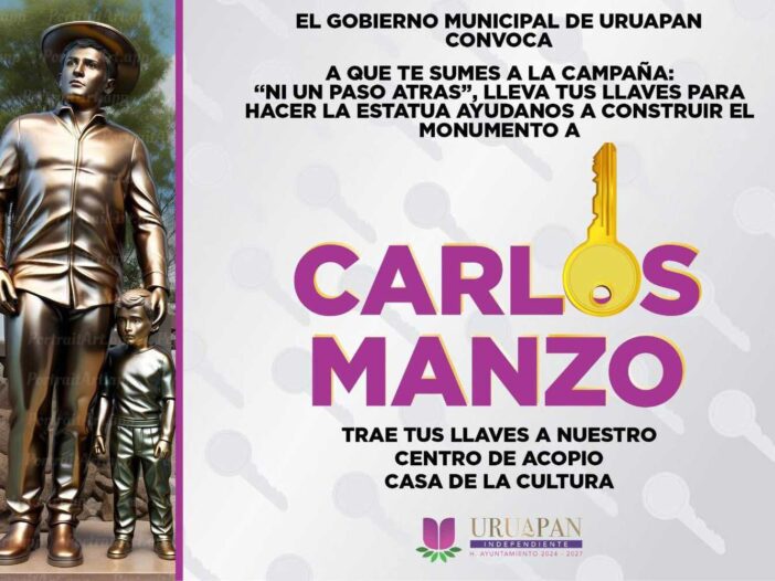 URUAPAN, Mich. – El Gobierno Municipal de Uruapan lanzó la campaña “Ni un paso atrás” para recolectar llaves metálicas que serán fundidas y transformadas en una escultura conmemorativa dedicada al exalcalde Carlos Manzo, asesinado el 1 de noviembre durante el Festival de las Velas.
