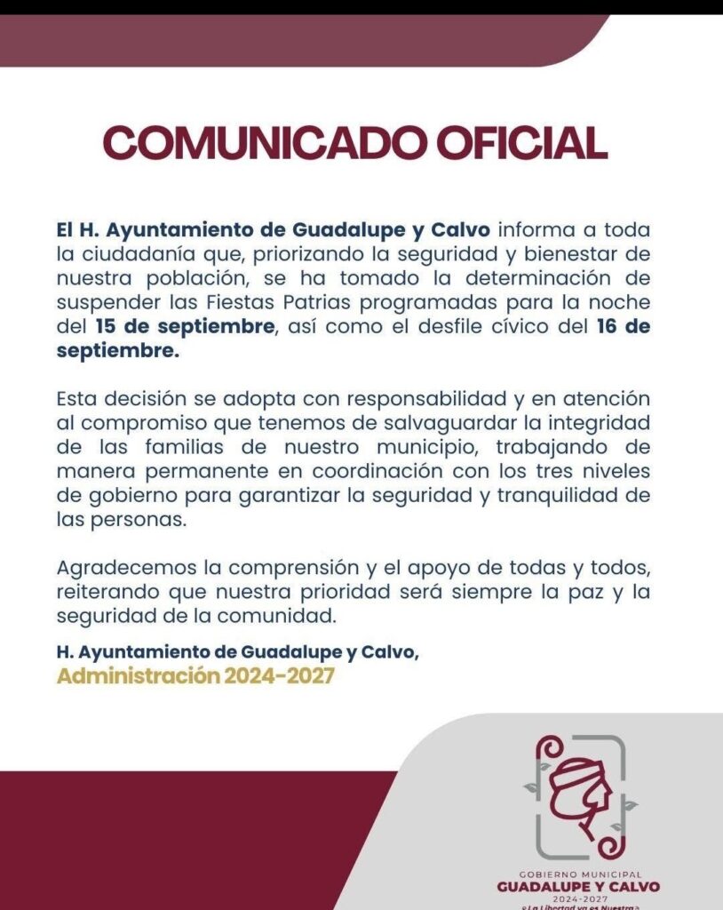 Representantes de fuerzas federales en la localidad, se quejaron de que la alcaldesa del municipio de Guadalupe y Calvo suspendiera el Grito y el Desfile de Independencia, a pesar del reforzamiento de la seguridad que se había implementado en la región desde días antes del 15 y 16 de septiembre.