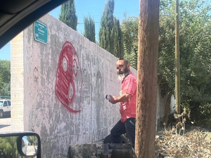 Los hechos ocurrieron en el cruce de las calles Crisol y eje vial Juan Gabriel, en la colonia El Vergel, donde los oficiales sorprendieron en flagrancia a José Adrián A. M. de 43 años, conocido como el ‘Bichos’, mientras utilizaba pintura en aerosol de color rojo para dañar una pared.