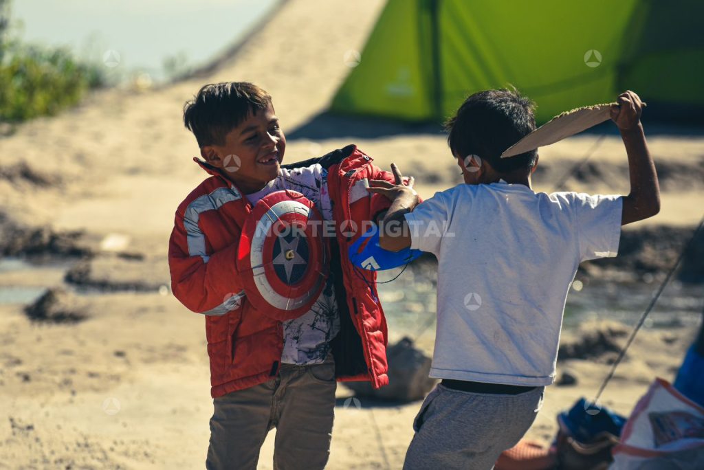 Eso se ve aún arriba del bordo, antes de bajar al río. Al bajar, no hay tantos sonidos. Mientras se avanza entre las carpas, se escuchan risas y charlas. Algunos pocos llegan a discusiones intensas sobre cruzar el río, sobre lo que está pasando en políticas migratorias, sobre lo que se dice sobre ellos en los medios de comunicación.