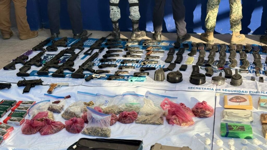 El subsecretario de Estado Mayor de la SSPE, Luis Ángel Aguirre, informó que la intervención tuvo lugar este domingo 14 de diciembre e incluyó el aseguramiento de 36 cargadores para arma larga, 60 cargadores para arma corta y cinco cargadores de tambor. También se decomisaron 5 mil cartuchos útiles, 14 chalecos balísticos y 25 placas balísticas.