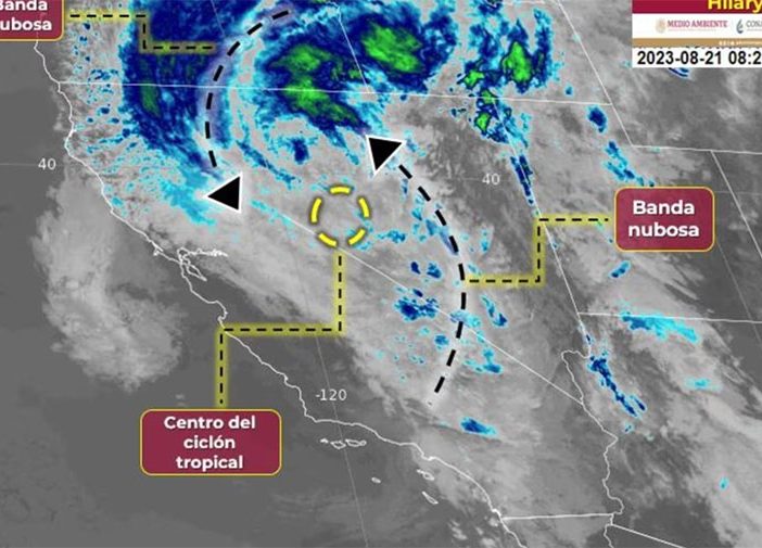 “Hilary” se degradó a ciclón post-tropical sobre Nevada, en Estados Unidos y su circulación ocasiona lluvias y chubascos, rachas fuertes de viento y oleaje elevado en zonas costeras de Baja California.