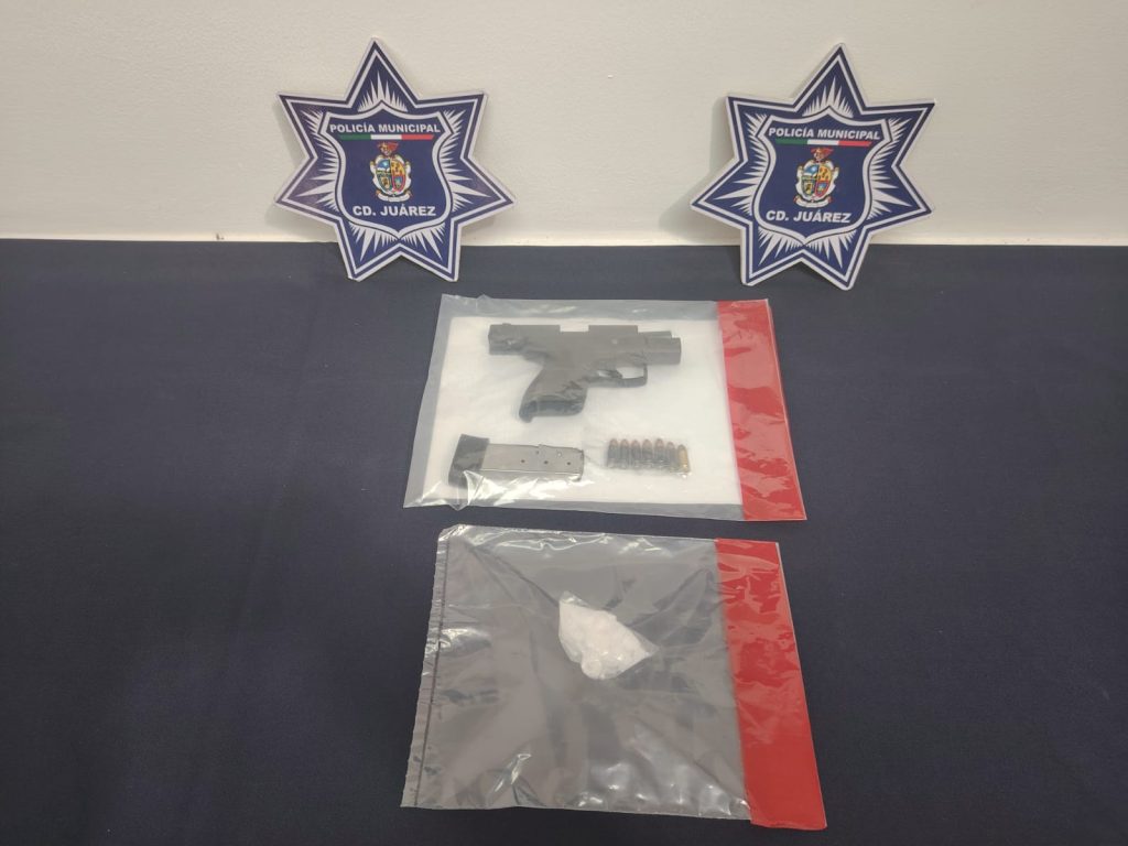 Elementos de la Secretaría de Seguridad Pública Municipal detuvieron a un hombre de 53 años y a una mujer de 33 años tras sorprenderlos discutiendo acaloradamente dentro de un Chevrolet Sprint negro modelo 2002, donde les encontraron un arma de fuego calibre 9 milímetros con cargador abastecido y 17.7 gramos de cristal.