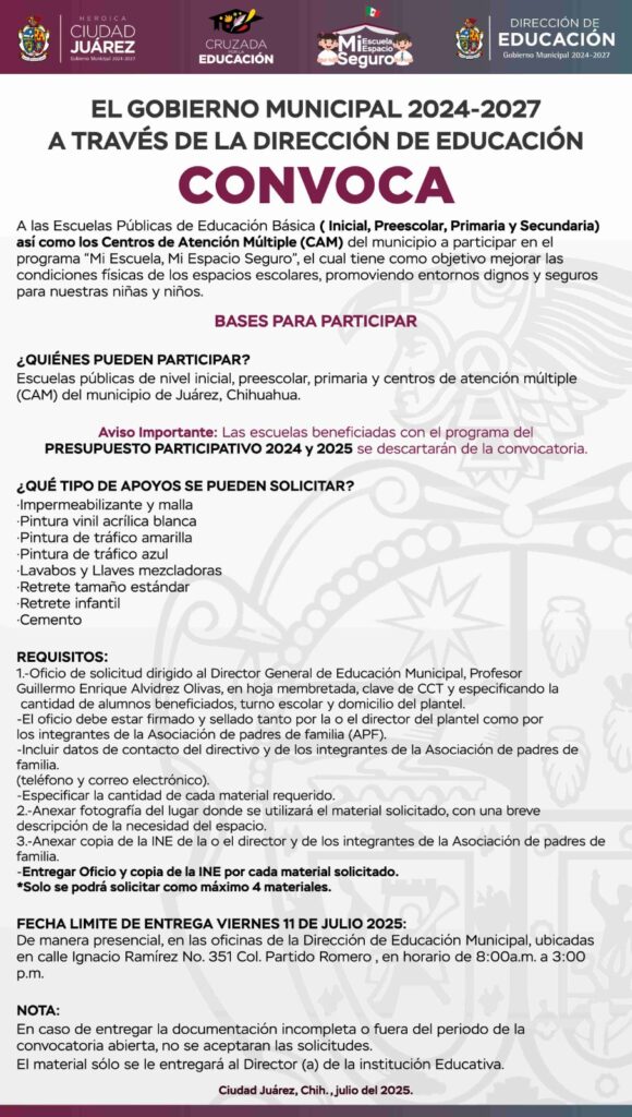 Guillermo Enrique Alvídrez Olivas, director de Educación Municipal, recordó que el objetivo es apoyar a los centros educativos que no han resultado beneficiados con el programa del Presupuesto Participativo durante el 2024 y 2025, detalló.