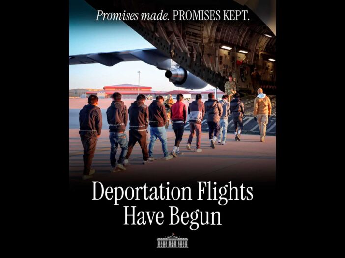 “Deportation flights have begun” (Los vuelos de deportación han comenzado), se lee en la parte baja de la imagen compartida, lo que ha causado la indignación de grupos derecho humanistas que consideran la fotografía degradante.