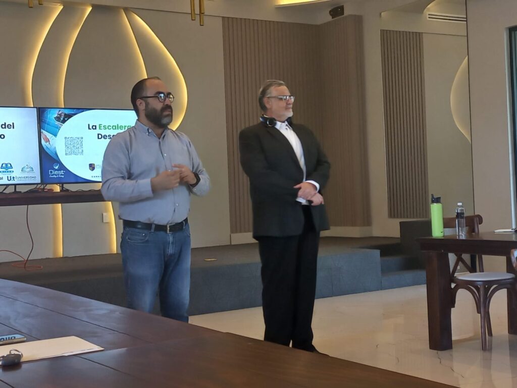 Bajo el título “La escalera al desarrollo empresarial”, el conferencista juarense Hugo Becerra impartió una cátedra a más de 40 empresarios de diferentes sectores que se dieron cita este martes en el salón de eventos Venue 16.