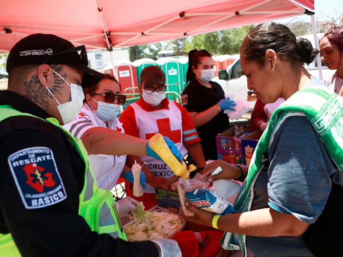 El Grupo de Veteranos de la Cruz Roja Mexicana Ciudad Juárez acudió esta mañana al refugio temporal recién abierto, para entregar diversos apoyos a los 243 migrantes que fueron canalizados por autoridades municipales.