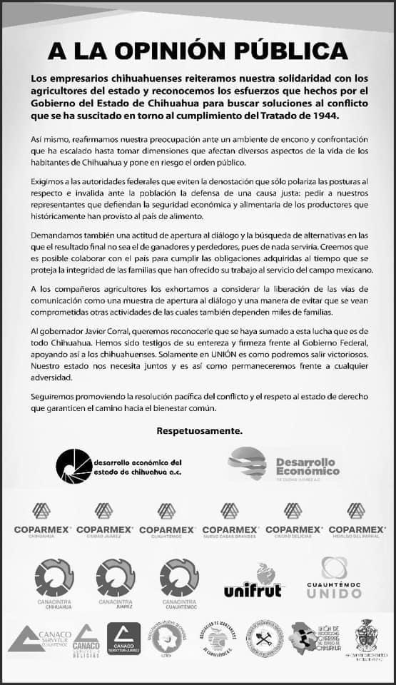 Empresarios chihuahuenses de organismos como Desarrollo Económico de Juárez y Chihuahua, así como las seis delegaciones de Coparmex, tres de Canacintra, Canaco, y productores de la región de Delicias, manifestaron su “solidaridad con los agricultores del estado y reconocemos los esfuerzos del gobierno del estado para buscar soluciones al conflicto que se ha suscitado en torno al cumplimiento del Tratado de 1944”.