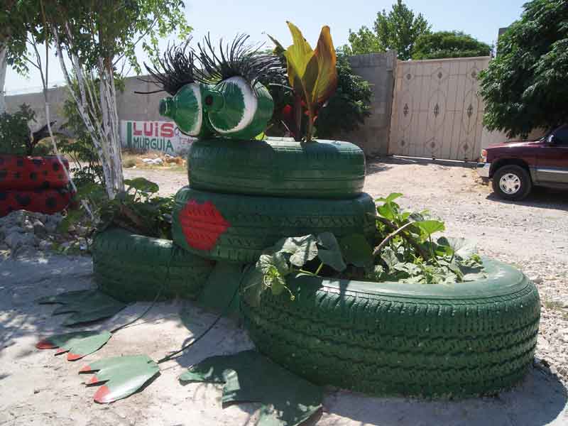 Vecinos de Colinas del Sur emplean con creatividad llantas para mejorar su entorno