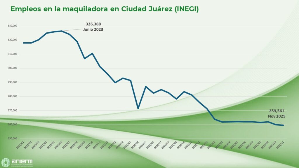 Datos del Instituto Nacional de Estadística y Geografía (Inegi), indican que, de agosto de 2023 a noviembre de 2025, el país perdió 183 mil empleos maquiladores; la tercera parte de esa cifra -unos 67 mil lugares- correspondió a Ciudad Juárez, señaló el delegado de la Asociación de Importadores y Exportadores de la República Mexicana (Anierm), Marcelo Vázquez Tovar.