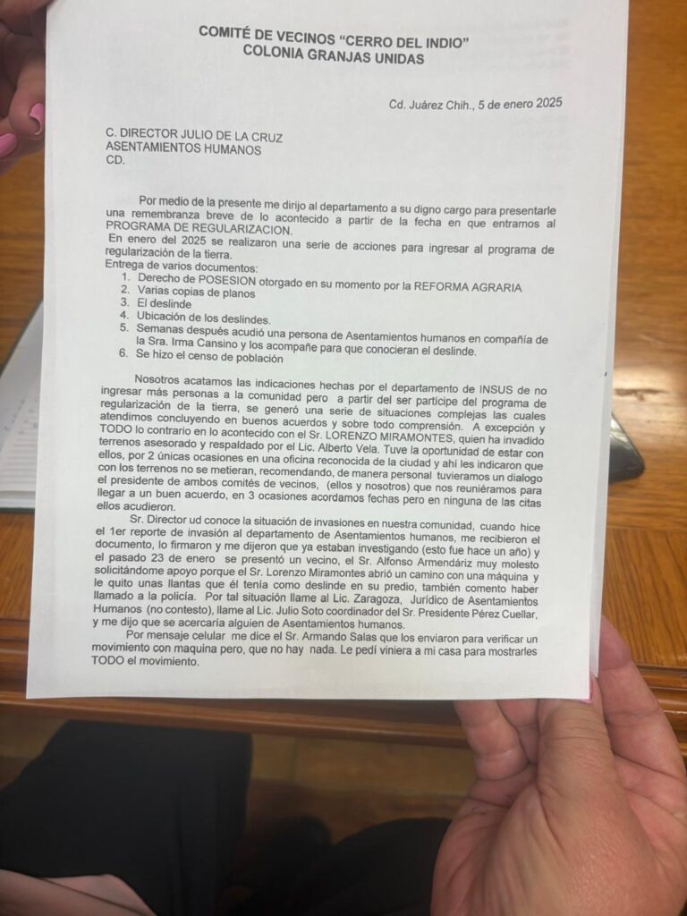 Ante los funcionarios de Asentamientos Humanos del Municipio de Juárez, denunciaron que los presuntos invasores están tomando posesión de grandes extensiones de terreno, sin autorización del Municipio ni del INSUS, que mediante un convenio firmado en 2025 regularizó la posesión de terrenos nacionales a favor de más de tres mil familias.