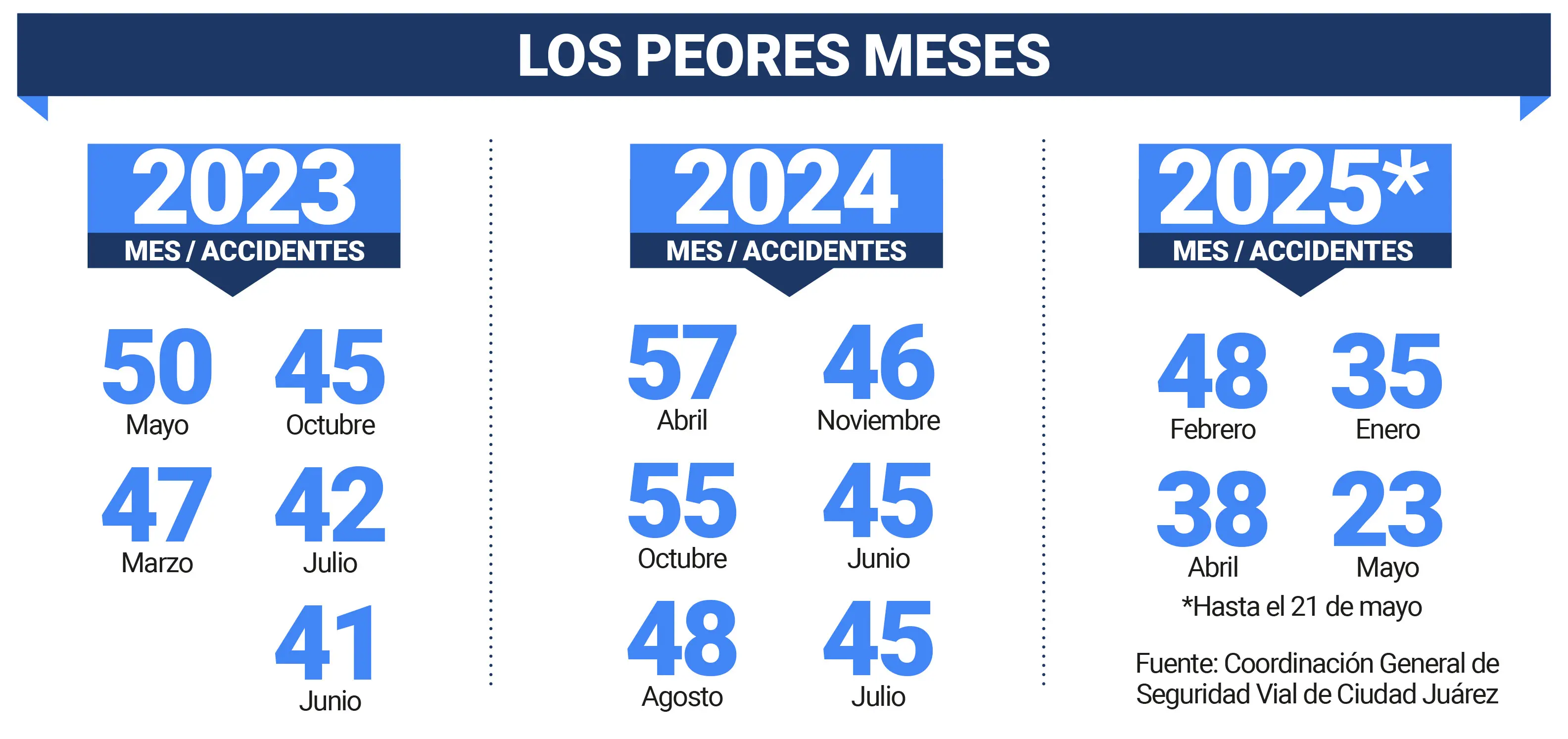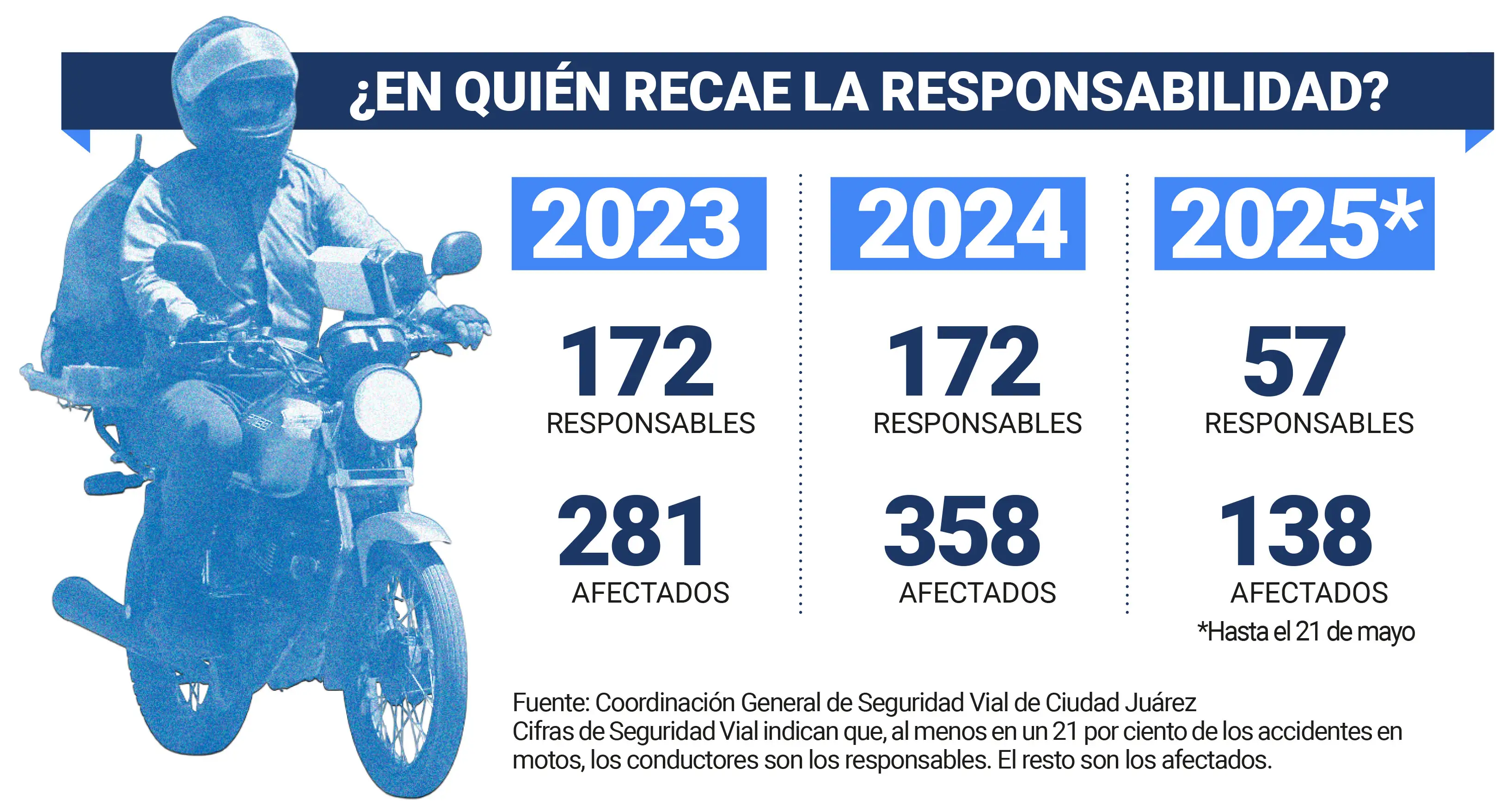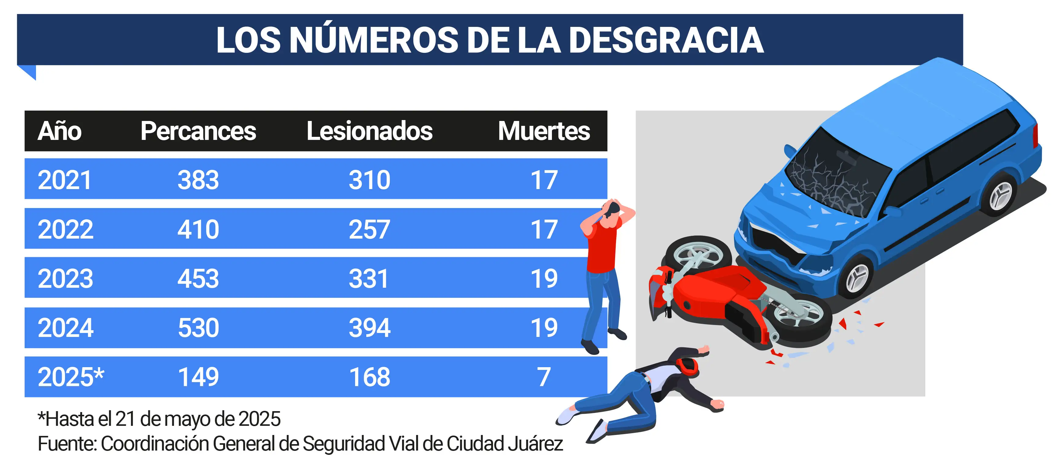 El año 2021 cerró con 17 motociclistas muertos en Ciudad Juárez. La cifra se repitió al año siguiente. Para el 2023 subió a 19 personas fallecidas, un comportamiento que se repitió en 2024.