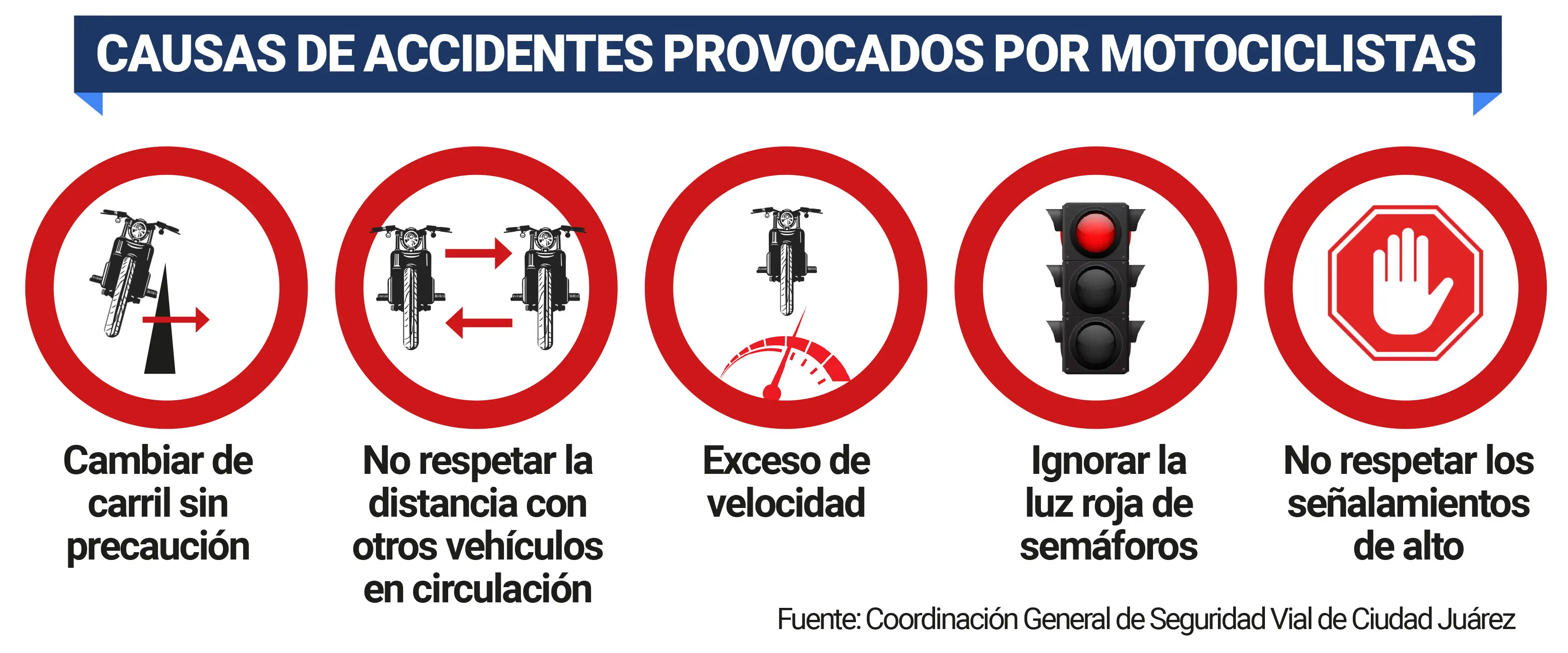 Al hablar sobre la responsabilidad de los motociclistas en accidentes, la Coordinación de Seguridad Vial menciona que las principales causas son el cambio de carril sin precaución, no conservar la distancia con otros vehículos, el exceso de velocidad, pasarse los semáforos en rojo y no respetar el señalamiento de alto.