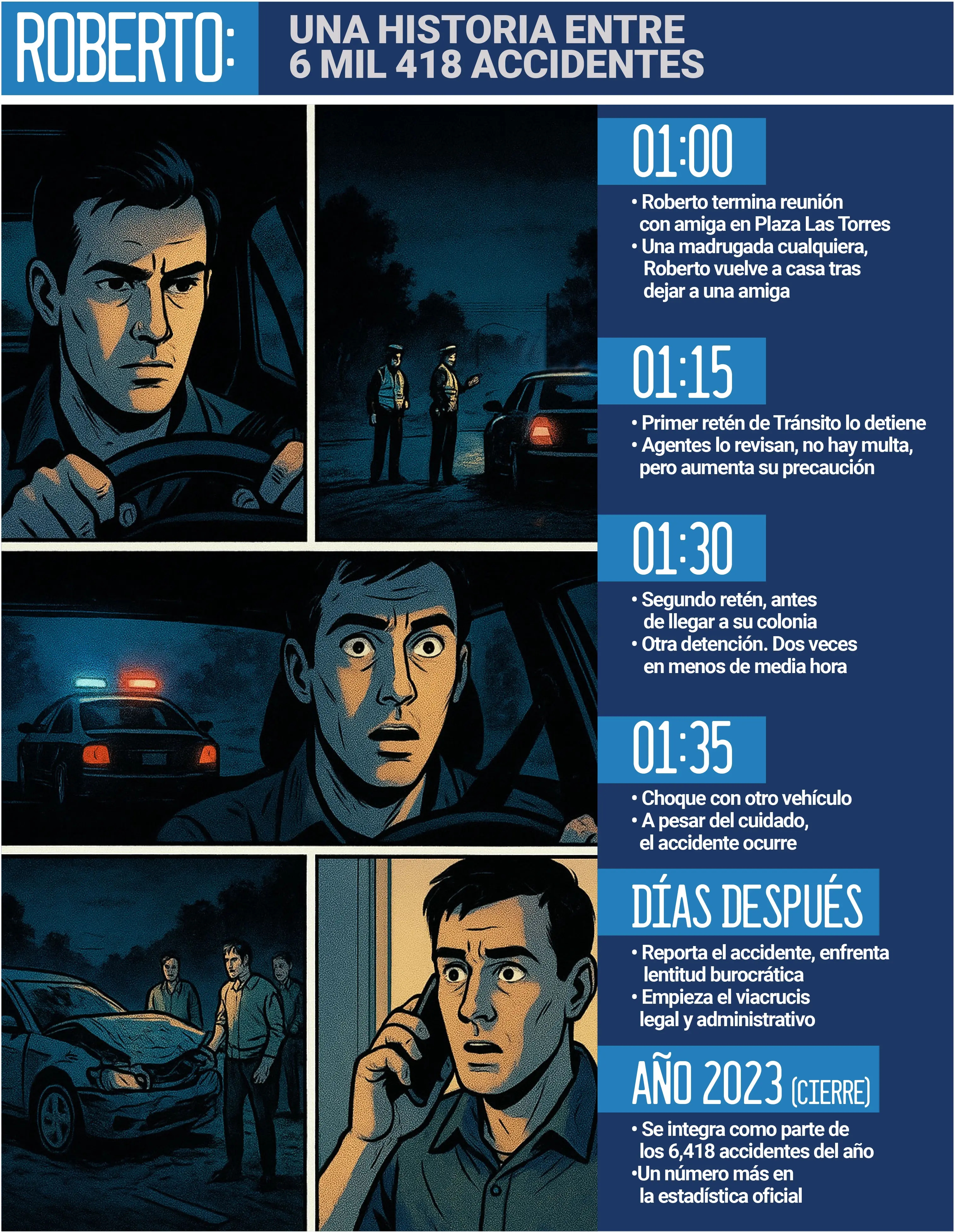 En los 25 años que Roberto lleva manejando en las calles de Ciudad Juárez, nunca había sufrido un accidente de tránsito. Cuenta que eso cambió el año pasado durante una madrugada de octubre.