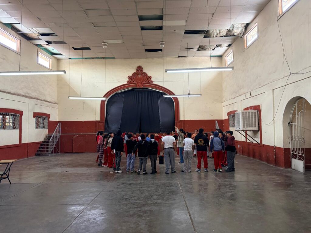 Precisamente, el salón de actos es una de las áreas que más llama la atención. Es amplio y cuenta con un escenario construido como los teatros de principios del siglo pasado, con un gran adorno en su parte superior.