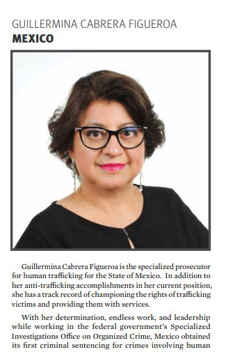 Se trata de Guillermina Cabrera Figueroa, quien en 2021 fue distinguida por el Departamento de Estado norteamericano como una de las “Héroes del Informe sobre la Trata de Personas (TIP Report Heroes 2021)”, por su destacado trabajo en la defensa de las víctimas y el combate a este delito.