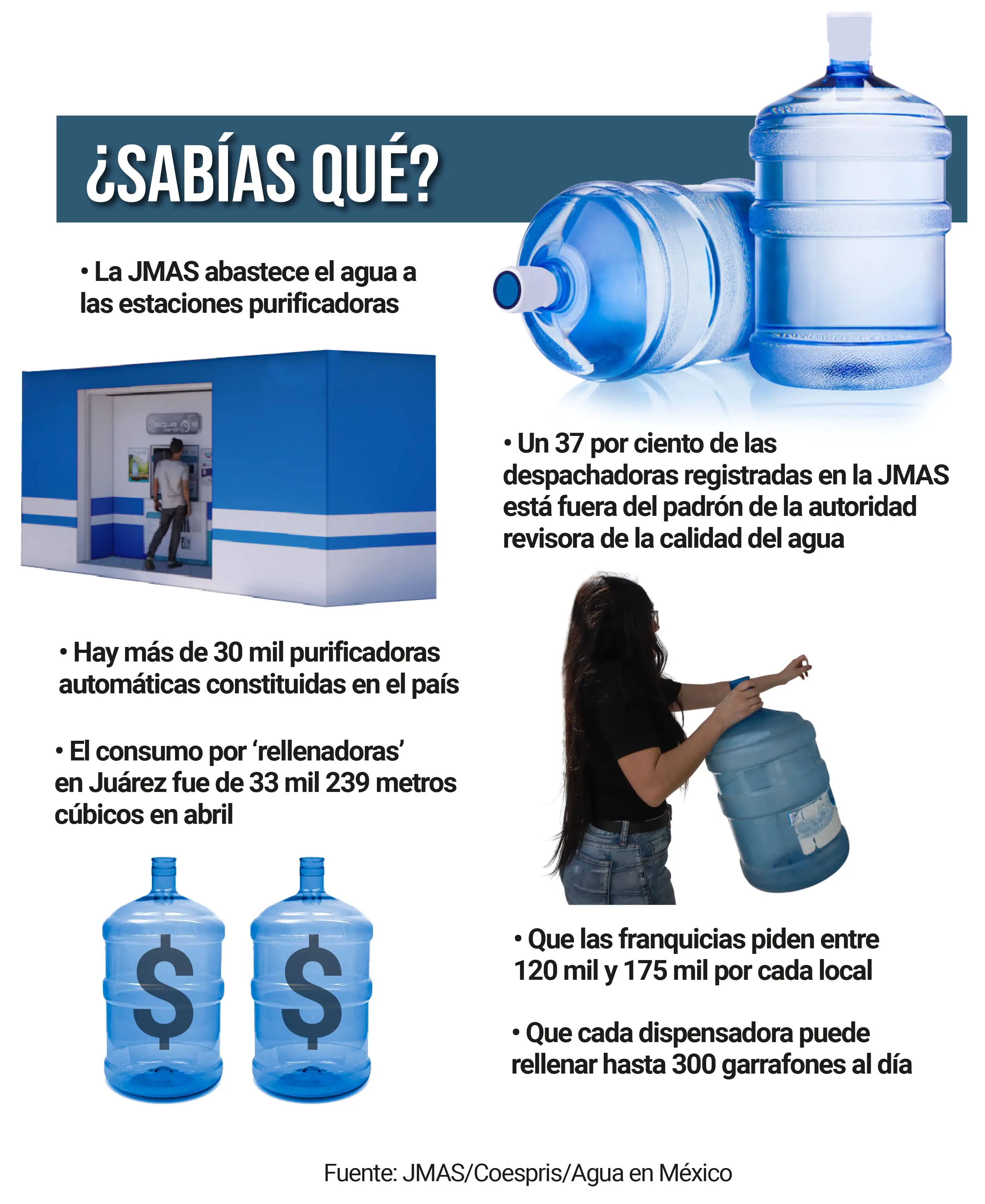 La Junta Municipal de Agua y Saneamiento (JMAS) de Juárez tiene registradas 667 casetas purificadoras de agua a través de ósmosis inversa, instaladas tanto en domicilios particulares como en expendios. Tan solo en el último mes, estas estaciones consumieron un total de 33 mil 239 metros cúbicos de agua.