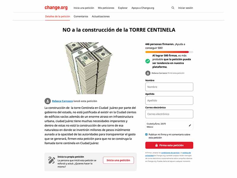 La peticionaria pide firmar en la plataforma “para que no se construya la llamada Torre Centinela en Ciudad Juárez”.