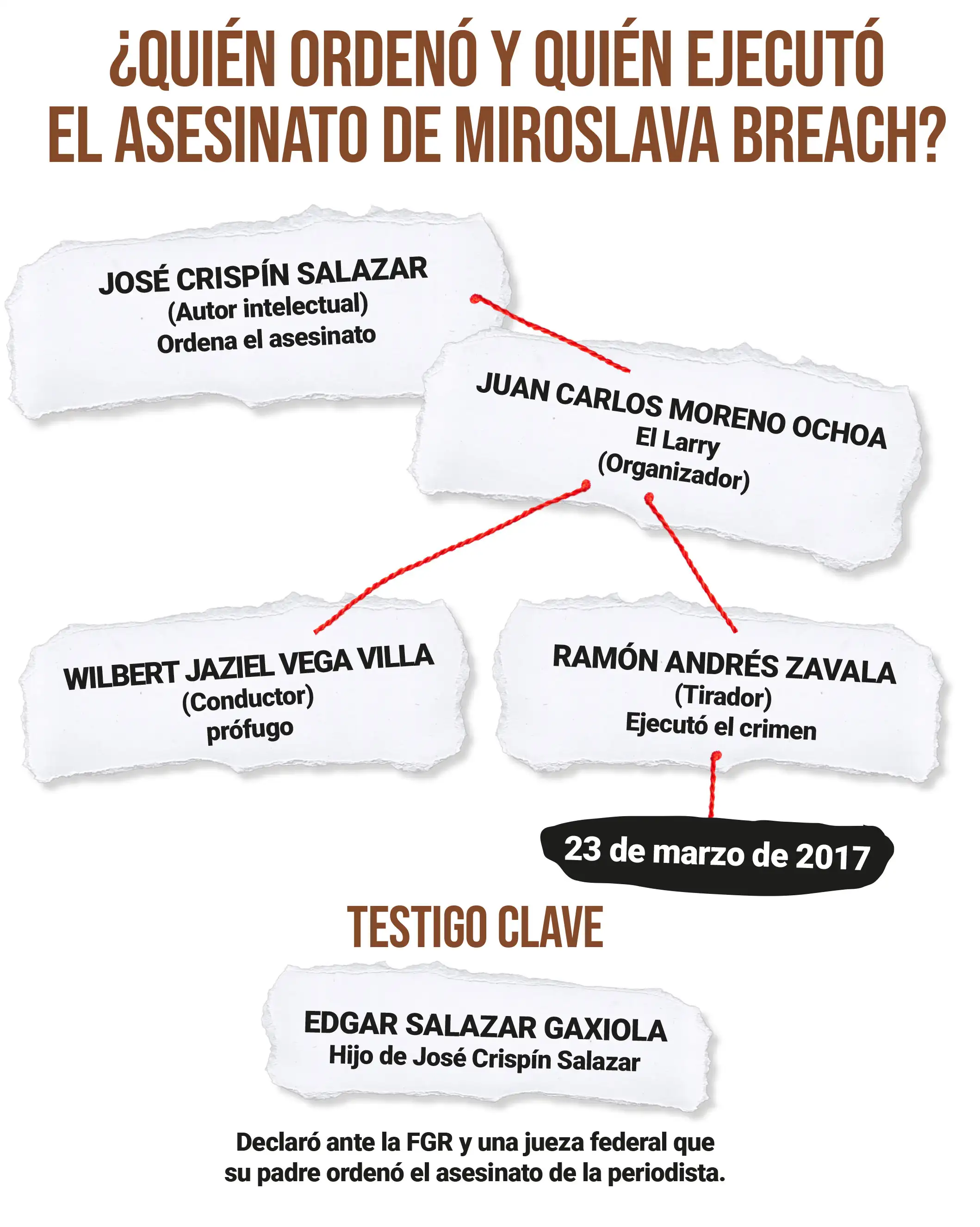 “Es mi deseo declarar que sí tengo parentesco con una persona involucrada en el homicidio de la periodista Miroslava Breach Velducea, porque es mi papá, el señor Crispín Salazar Zamorano, y fue quien la mandó matar”.
