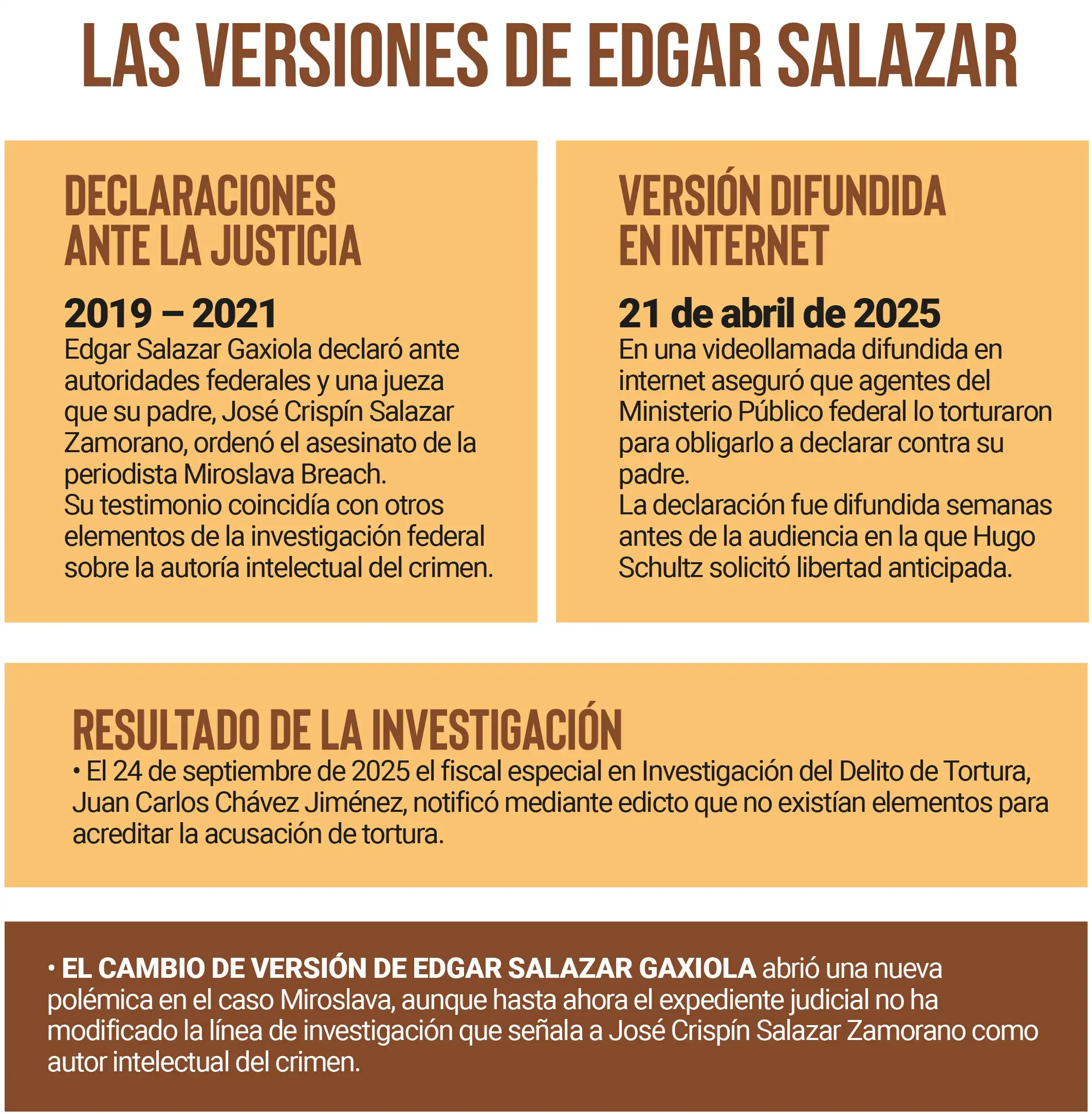 Un episodio más en la trama de complicidades y mentiras que siguieron al homicidio de Miroslava Breach Velducea lo protagonizó Edgar Salazar Gaxiola, hijo de José Crispín Salazar Zamorano, quien fue presentado como testigo de la Fiscalía en 2019.