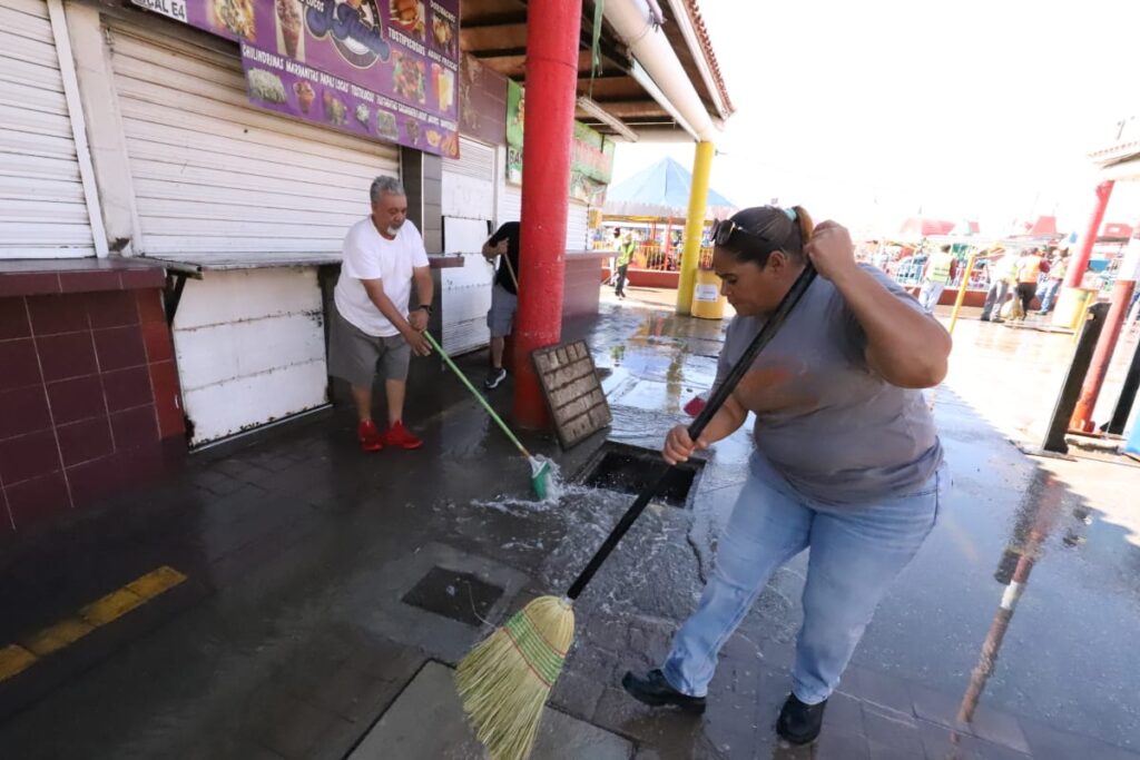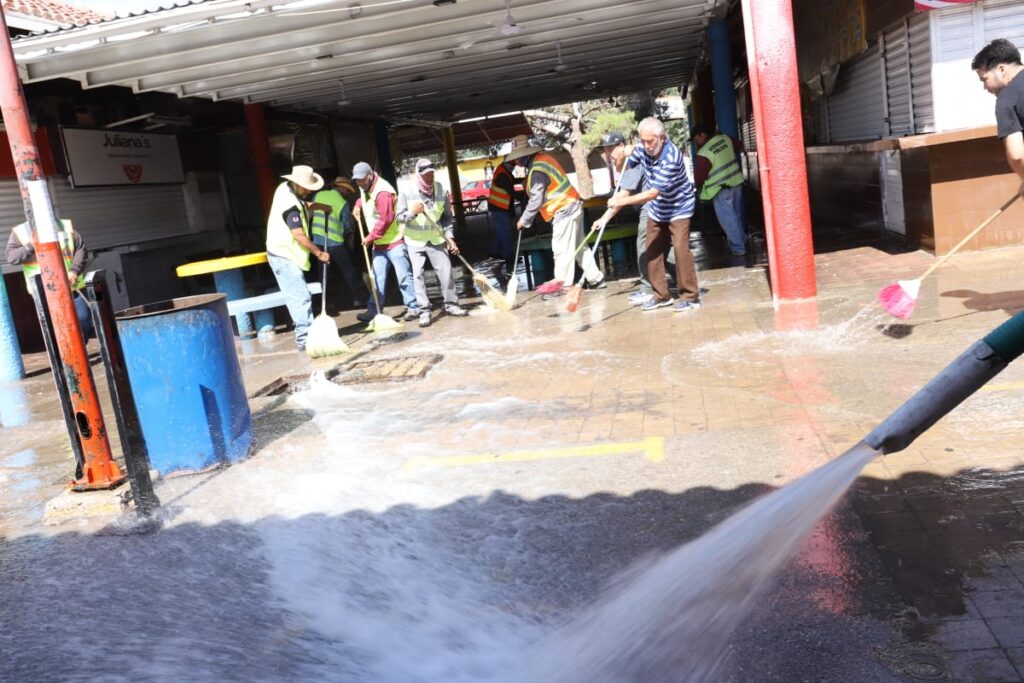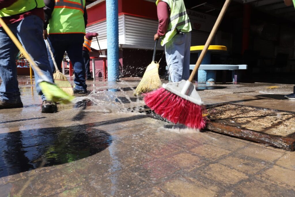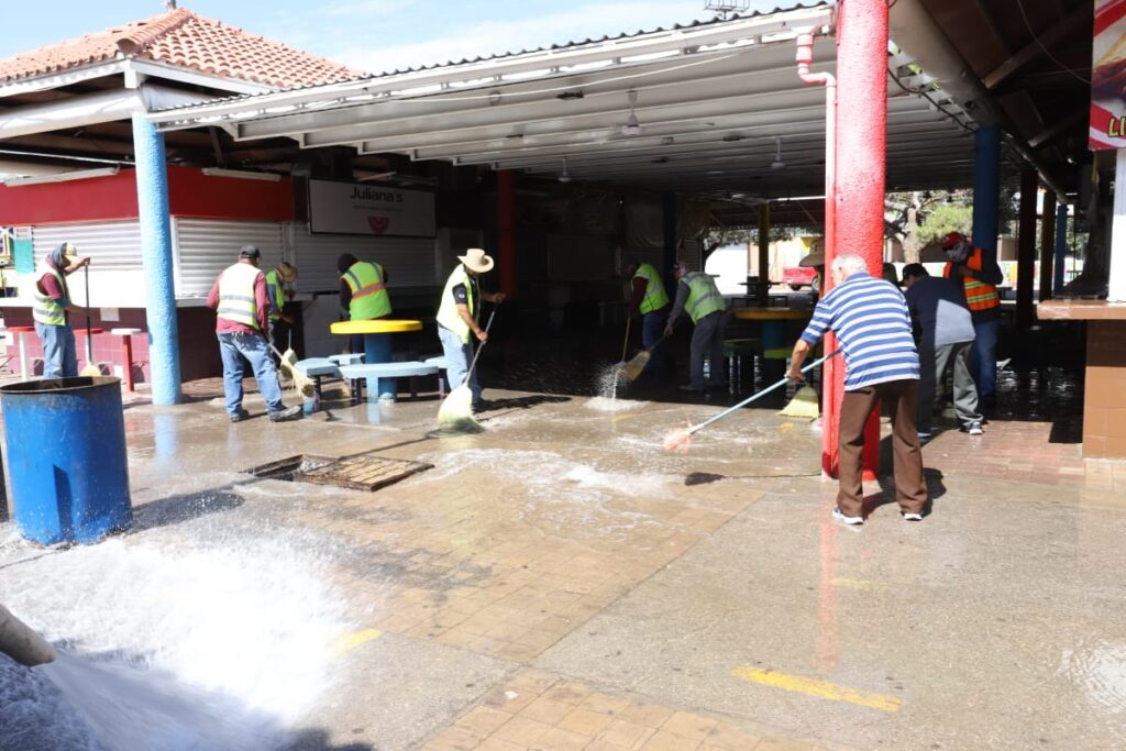 Durante la mañana del miércoles, el personal de Limpia se desplegó sobre el área de venta de alimentos del Parque Borunda para limpiar los pasillos con la ayuda de varios comerciantes que se sumaron al operativo.