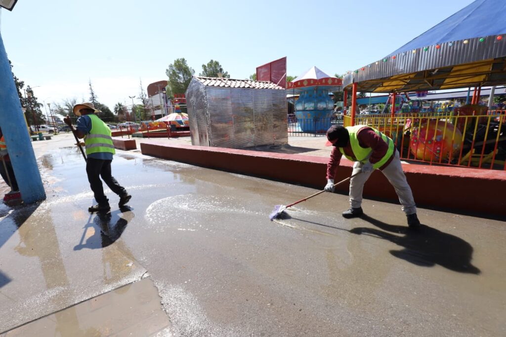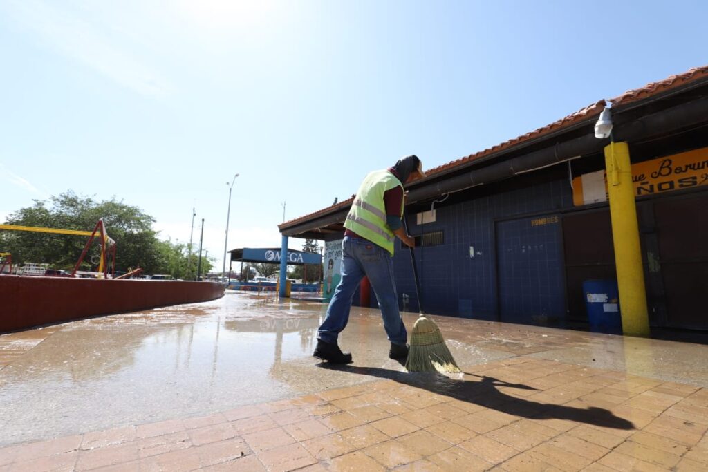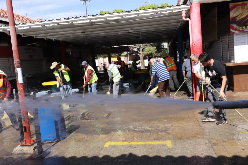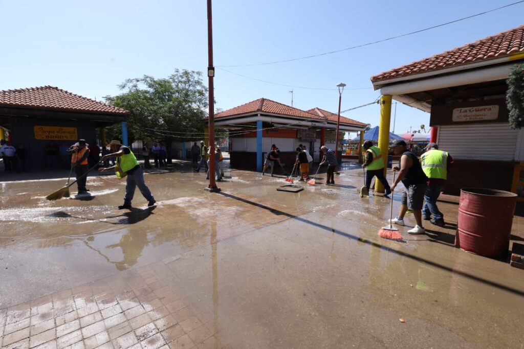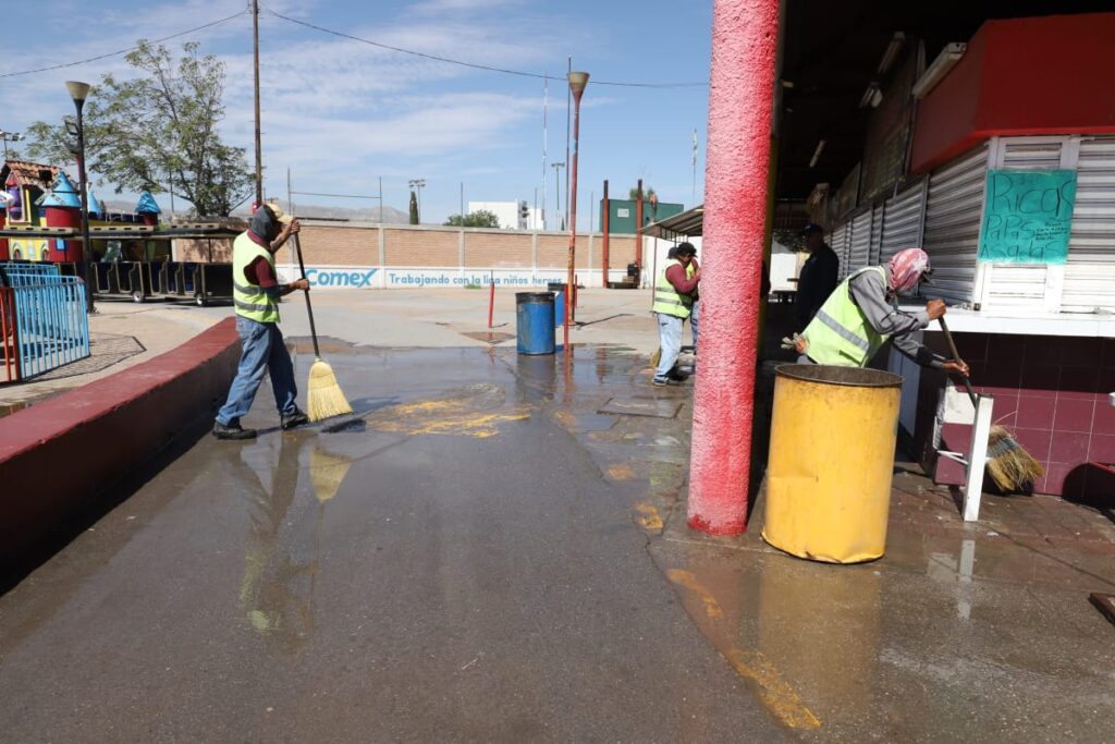Durante la mañana del miércoles, el personal de Limpia se desplegó sobre el área de venta de alimentos del Parque Borunda para limpiar los pasillos con la ayuda de varios comerciantes que se sumaron al operativo.