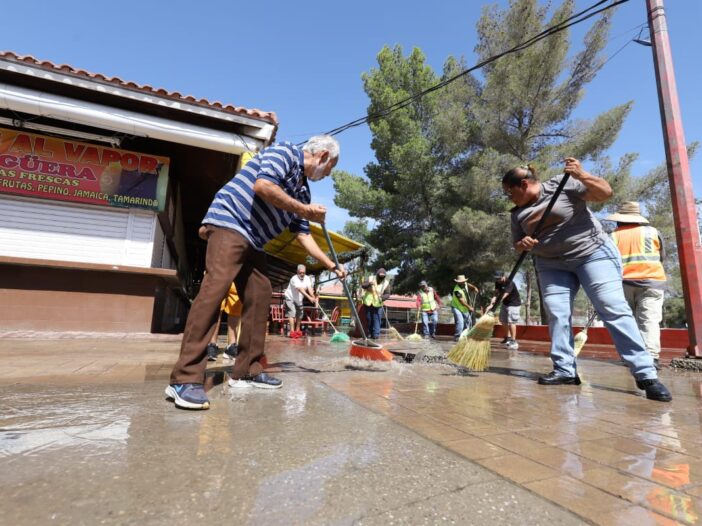 Durante la mañana del miércoles, el personal de Limpia se desplegó sobre el área de venta de alimentos del Parque Borunda para limpiar los pasillos con la ayuda de varios comerciantes que se sumaron al operativo.
