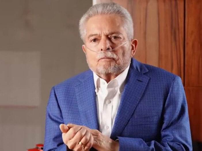 Vestido con saco azul claro a cuadros y camisa color crema, con los conductos de oxígeno sujetos a sus fosas nasales, Cruz Russek aparece en el video dirigido a los integrantes de una convención del grupo GR3, para explicar que su ausencia se debe a su delicada condición de salud.