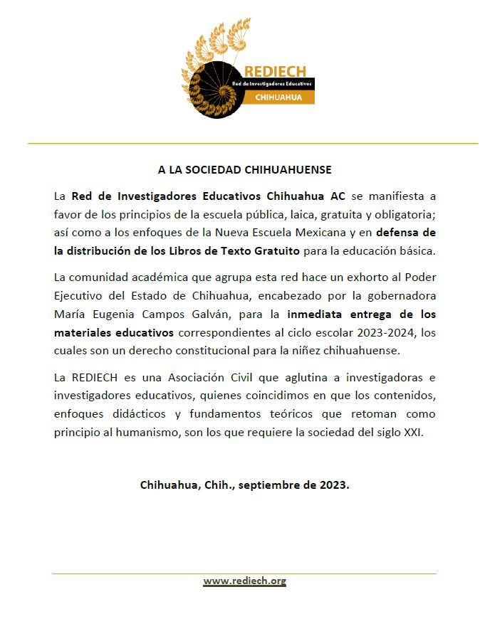 La Red de Investigadores Educativos de Chihuahua A.C. a través de sus redes sociales emitió un posicionamiento a favor de los enfoques de la Nueva Escuela Mexicana y en defensa de la distribución de los libros de texto elaborados por la Secretaría de Educación Pública para el ciclo escolar 2023-2024.