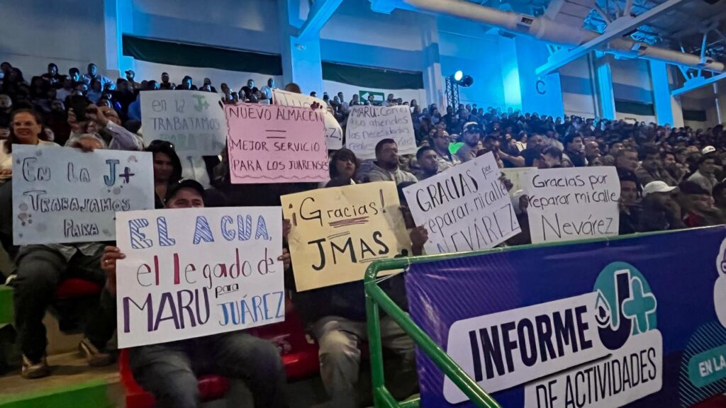 Durante el evento no faltaron las cartulinas con mensajes de apoyo: “Juárez con Nevárez”, “Yo amo a la JMAS” y “Gracias por reparar mi calle”, se leía entre el público.