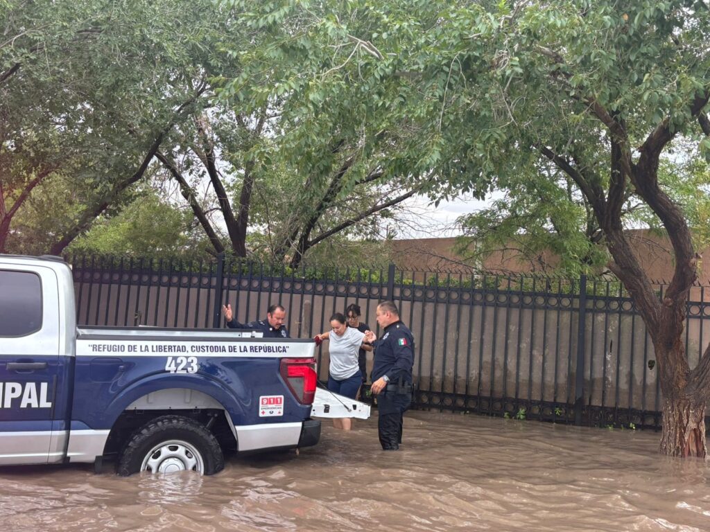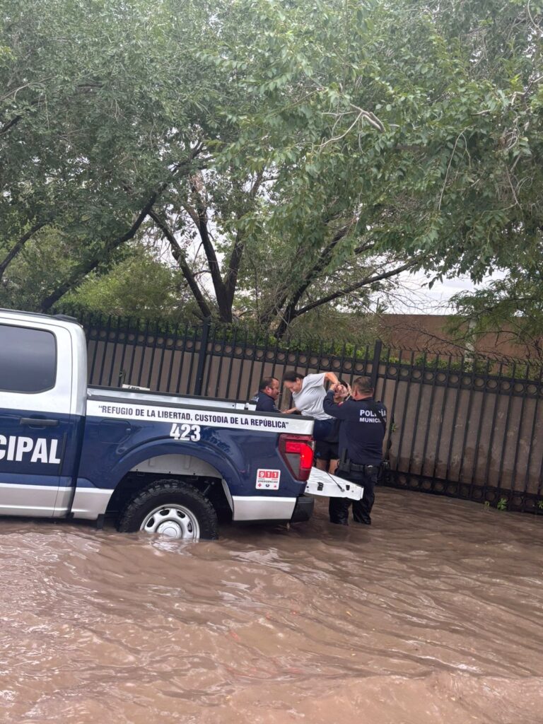 En una de las imágenes más representativas del día, elementos de la Policía Municipal ayudaron a mujeres y jóvenes a salir del agua que les llegaba a media pierna, luego de que el paso quedó interrumpido por las inundaciones.