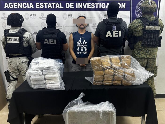 Elementos de la Agencia Estatal de Investigación, con apoyo de la Guardia Nacional y del Ejército Mexicano, detuvieron a Daniel Guillermo S. B., en posesión de más de 22 kilogramos de cocaína y marihuana.
