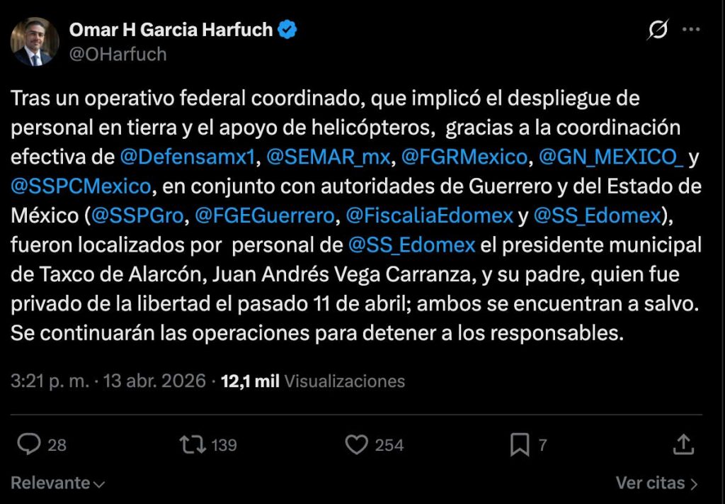 El secretario de Seguridad y Protección Ciudadana federal, Omar García Harfuch, informó que ambos se encuentran a salvo tras un operativo coordinado que incluyó personal en tierra, apoyo aéreo con helicópteros y la participación de la Secretaría de la Defensa Nacional, Secretaría de Marina, Guardia Nacional, Fiscalía General de la República, así como autoridades de Guerrero y el Estado de México.