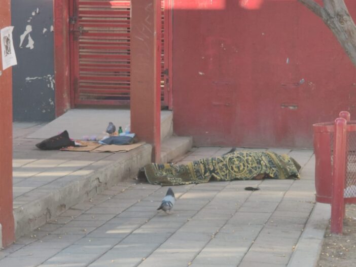 Otros habitantes del parque taparon el cuerpo con una cobija del Calendario Azteca y a unos metros había todavía algunas cartulinas colocadas en la plaza, como parte de la Marcha Incluyente.