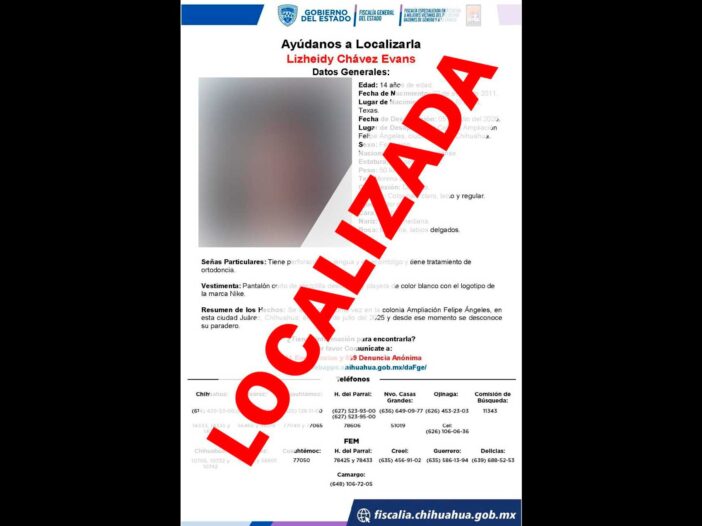 La Fiscalía Especializada en Atención a Mujeres Víctimas del Delito por Razones de Género y a la Familia (FEM), informó la localización de una menor que contaba con reporte de ausencia en Ciudad Juárez.