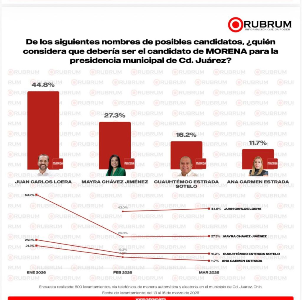 La más reciente encuesta de Rubrum sobre preferencias para las candidaturas a la alcaldía juarense, arrojó que por Morena aventaja el senador Juan Carlos Loera de la Rosa y por el PAN, la presidenta estatal de ese instituto político, Daniela Álvarez Hernández.