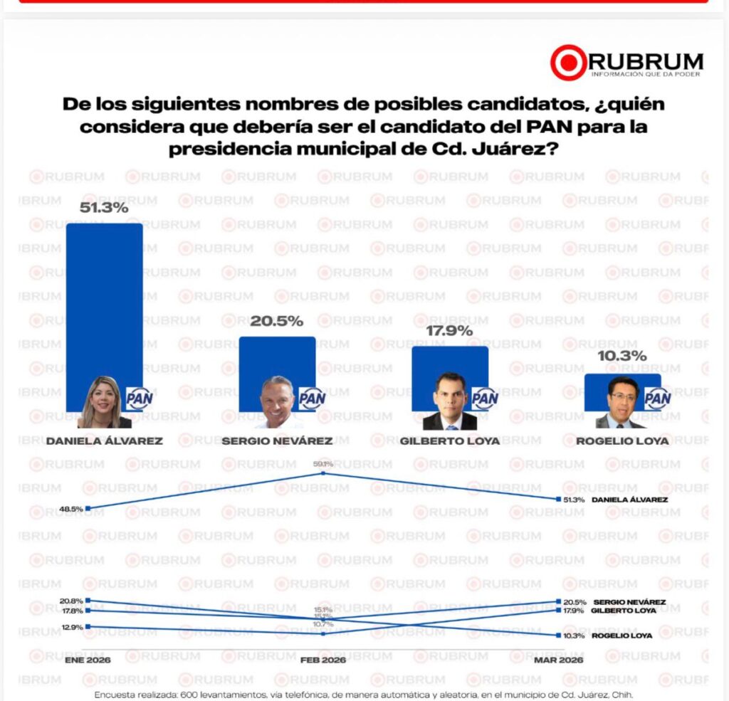 Respecto al PAN, la dirigente Daniela Álvarez se colocó en el primer sitio, con el 51.3 por ciento de las preferencias, seguida del exdirector ejecutivo de la Junta Municipal de Agua y Saneamiento, Sergio Nevárez, con el 20.5 por ciento de las preferencias.
