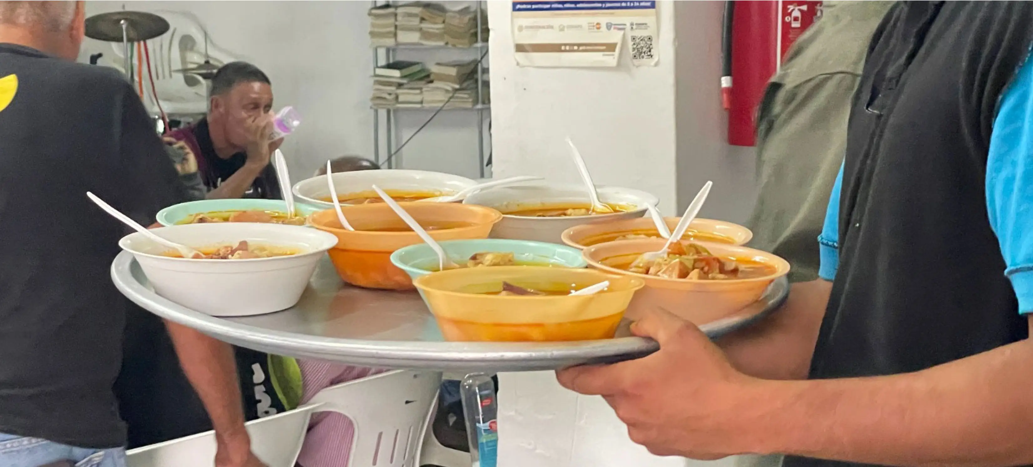 Es sábado y este día se sirvió menudo. Luis Moreno comentó que los alimentos que ofrecen son de donaciones que reciben de la comunidad, de algunos restaurantes y de una panadería, que buscan compartir con los más vulnerables.