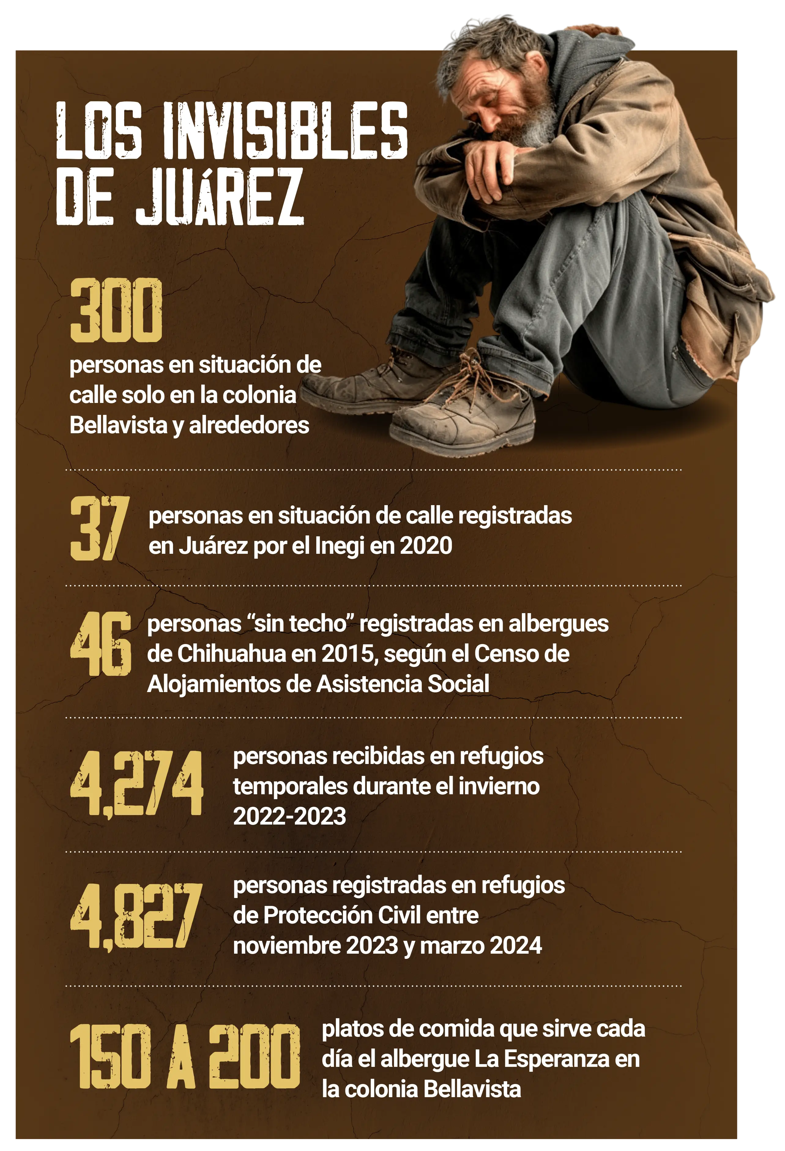 Estos números nos pueden dar una mejor idea de la cantidad de personas que habitan en las calles de Ciudad Juárez, ya que en los refugios solo se admite a personas locales mayores de edad, explicó el comandante González. Aunque muchas de ellas rechazan el techo temporal que se les ofrece.