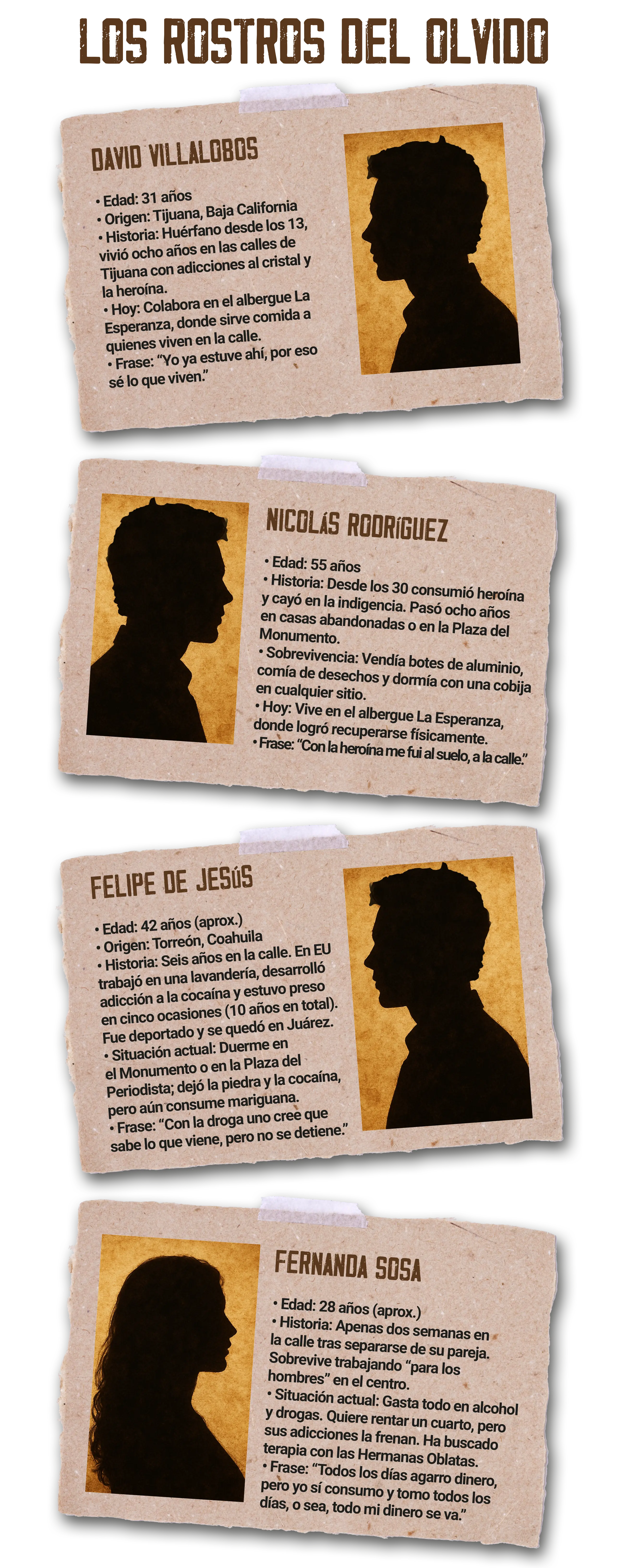 Villalobos, huérfano desde los 13 años, vivió ocho años en las calles de Tijuana, donde desarrolló adicciones al cristal y a la heroína. Ahora tiende la mano a personas que terminan desamparadas en las calles de Ciudad Juárez, donde decenas deambulan a la vista de todos.