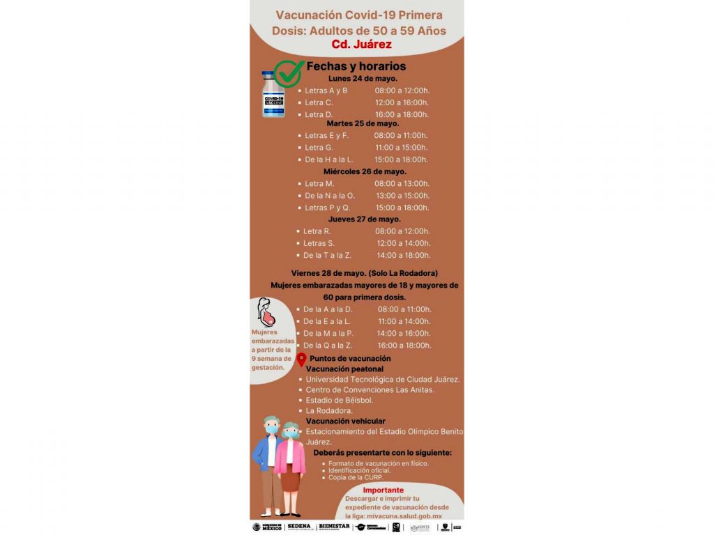 Este lunes a partir de las 8:00 horas empieza por primera vez en la vacunación anticovid para personas de 50 a 59 años en Ciudad Juárez.