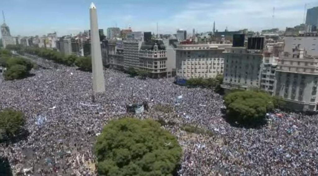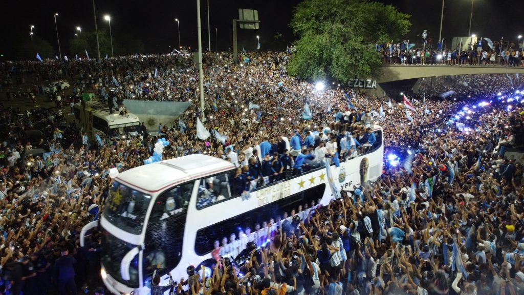En un ambiente de euforia masiva, millones de personas acompañan por las autopistas y calles de Buenos Aires el recorrido de Lionel Messi y su selección en la caravana para celebrar la Copa del Mundo, la tercera de Argentina, en una manifestación de dimensiones jamás vista en esta ciudad.