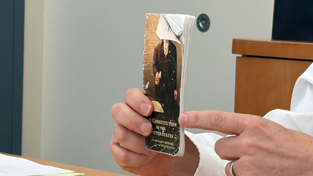 El plazo para interponer un recurso pasó de 30 días a 10, lo cual es prácticamente una condición de indefensión, subrayó mientras sostenía una constitución de los Estados Unidos que, dijo, siempre trae en el bolsillo.