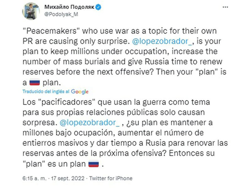 Mykhailo Podoliak, asesor del Jefe de la Oficina del presidente de Ucrania, Volodymyr Zelensky, por medio de un mensaje que publicó en Twitter, asegura que AMLO quiere usar la guerra para fortalecer sus relaciones públicas y que su plan pacificador favorece a Rusia.