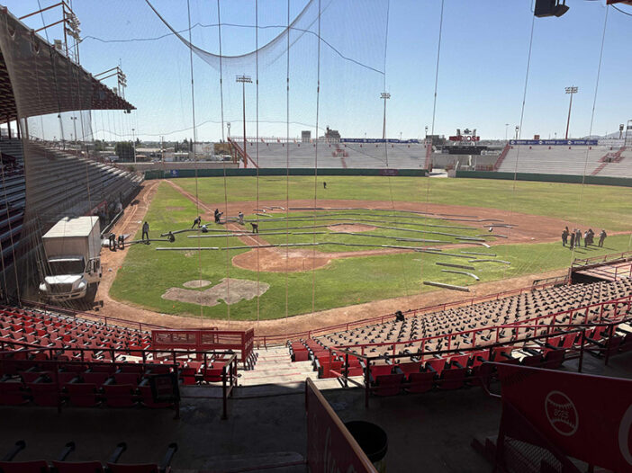 En el lugar se observó que, en el campo de juego, se montará el escenario en el que la presidenta dará su mensaje a la población fronteriza.