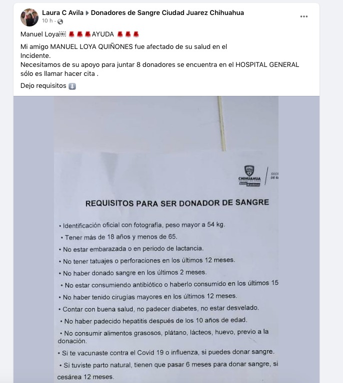 Por la mañana se solicitó la ayuda en el grupo de Facebook “Donadores de Sangre Ciudad Juárez Chihuahua”, ya que familiares pdían el apoyo de ocho donadores, junto a un documento con los requisitos exigidos por el Hospital General.
