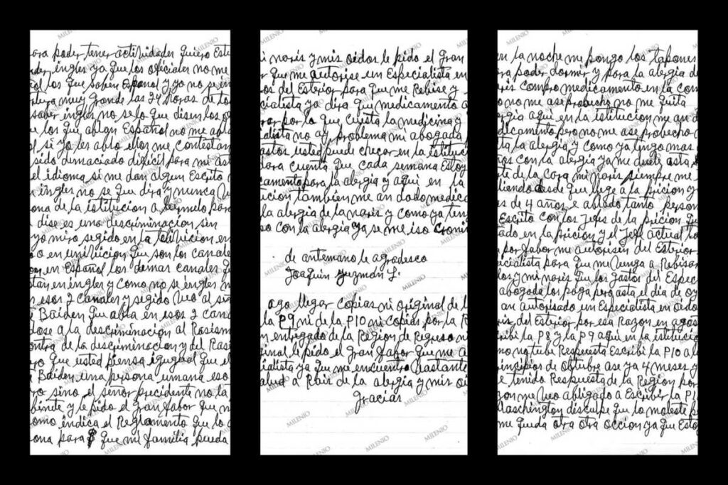 Entre el delirio, la enfermedad y la desesperanza. Así se muestran los extractos de las cartas escritas por Joaquín “El Chapo” Guzmán desde la prisión de máxima seguridad de Florence, Colorado, obtenidas por Milenio y dadas a conocer por el periodista Ángel Hernández.